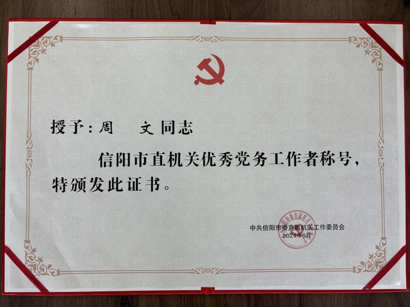 2024年6月28日,中共信陽市委直屬機(jī)關(guān)工作委員會印發(fā)《關(guān)于表彰市直機(jī)關(guān)優(yōu)秀共產(chǎn)黨員、優(yōu)秀黨務(wù)工作者和先進(jìn)基層黨組織的決定》(信直文﹝2024﹞17號)。華信建投集團(tuán)共有1名同志榮獲“市直機(jī)關(guān)優(yōu)秀共產(chǎn)黨員”稱號,1名同志榮獲“市直機(jī)關(guān)優(yōu)秀黨務(wù)工作者”稱號,2個(gè)基層黨組織榮獲“市直機(jī)關(guān)先進(jìn)基層黨組織”稱號。